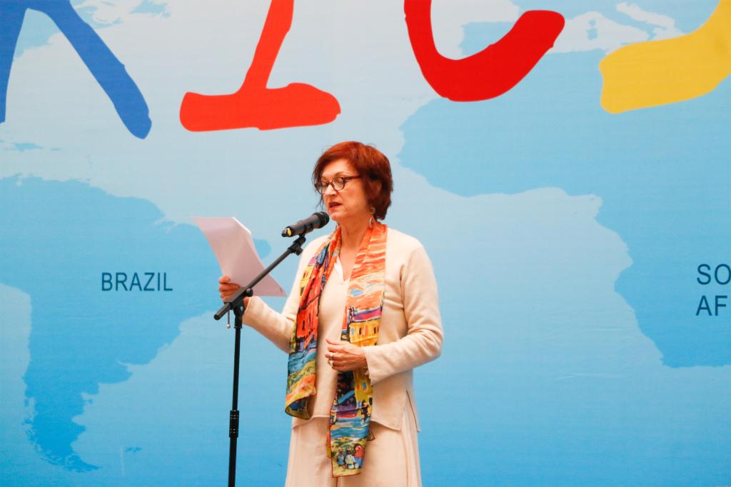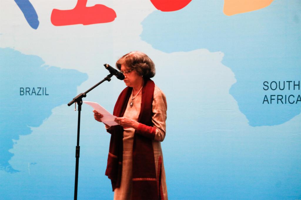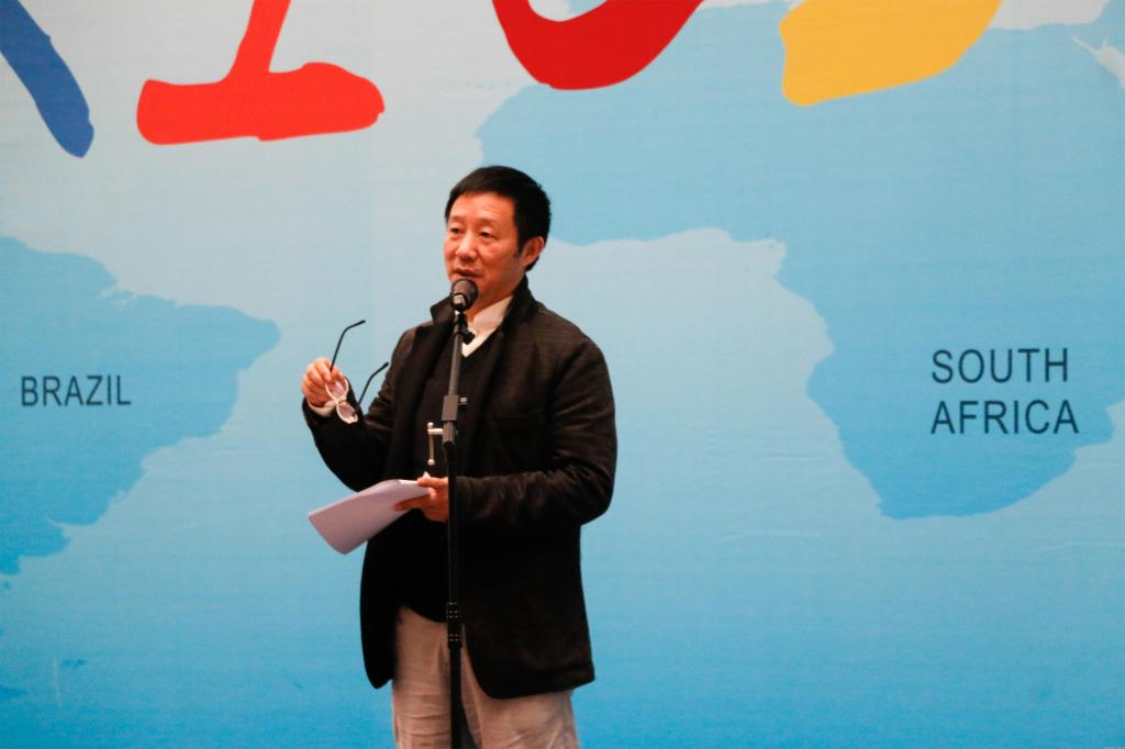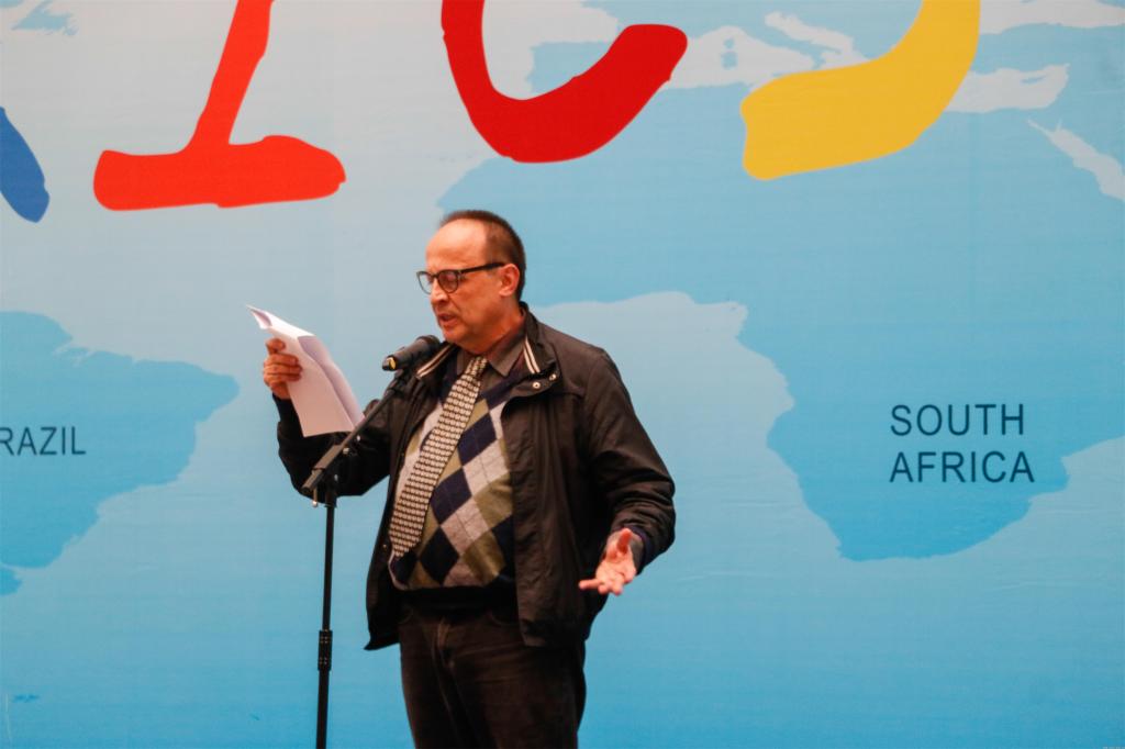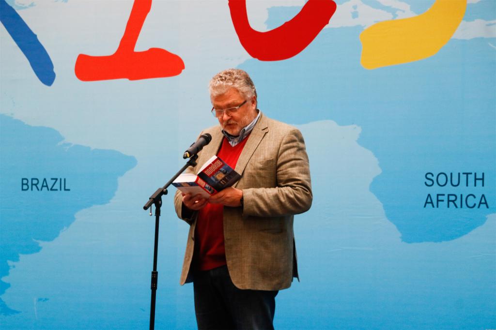 本网讯(校记者团:李月琛 贺钰涵 卢文钰)2017年12月17日下午3点30分,金砖五国作家代表齐聚我校图书馆二楼中庭开展文学作品朗诵会,这是金砖国家文学论坛的最后一项议程。作家代表依照“BRICS” (巴西、俄罗斯、印度、中国、南非)顺序依次上台朗诵,展现本国文学风采。此次朗诵会由著名诗人、北京师范大学特聘教授西川和中央电视台主持人田薇共同主持。
