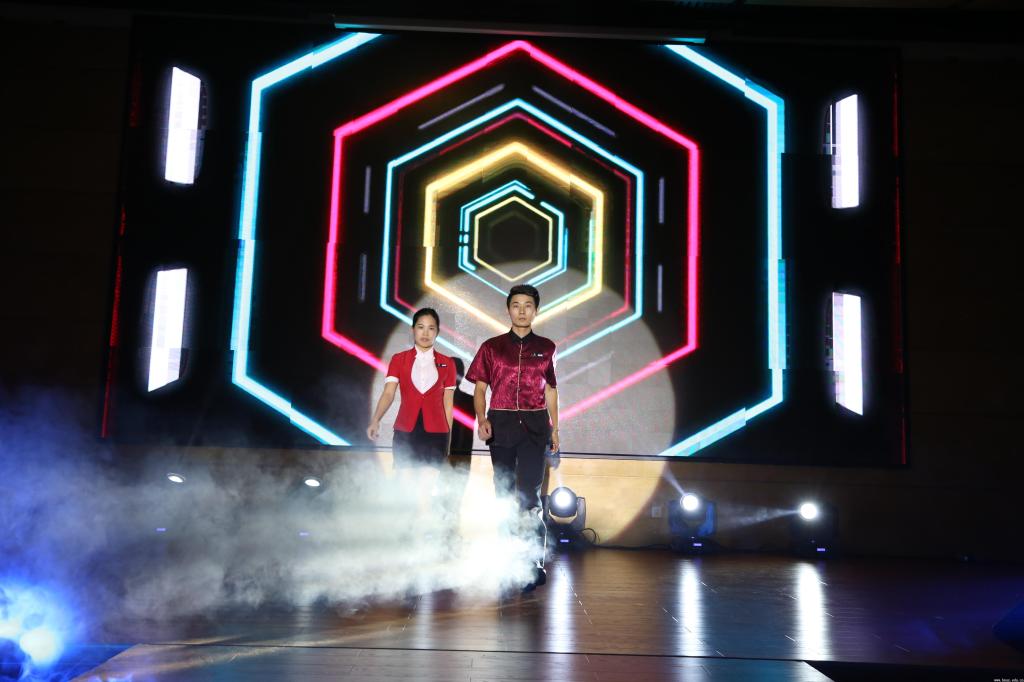 晚会中,教职工合唱团的一首《祖国你好》展现出我校教师昂扬奋进的精神风貌和对伟大祖国的热爱之情。资产公司和运动休闲学院联袂出演的时装秀更是不可忽视的亮点。俊男靓女身着不同种类的工作服和运动装备,伴随着节奏感极强的音乐在舞台上尽情展现青春朝气,让观众们大饱眼福。