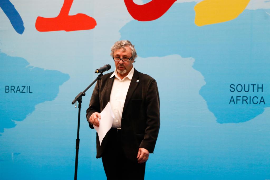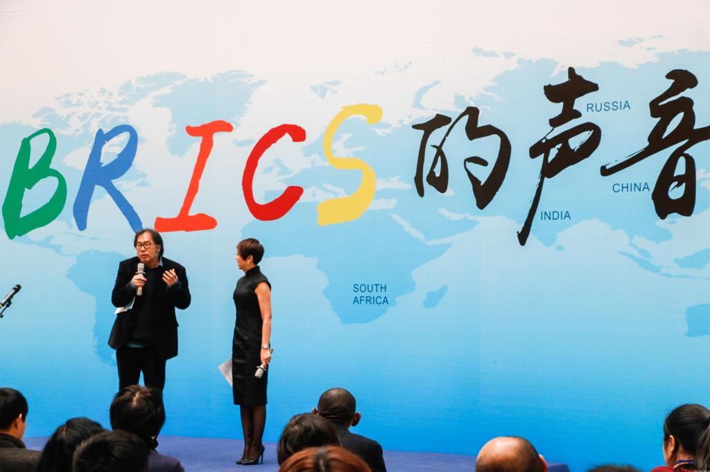 本网讯(校记者团:李月琛 贺钰涵 卢文钰)2017年12月17日下午3点30分,金砖五国作家代表齐聚我校图书馆二楼中庭开展文学作品朗诵会,这是金砖国家文学论坛的最后一项议程。作家代表依照“BRICS” (巴西、俄罗斯、印度、中国、南非)顺序依次上台朗诵,展现本国文学风采。此次朗诵会由著名诗人、北京师范大学特聘教授西川和中央电视台主持人田薇共同主持。