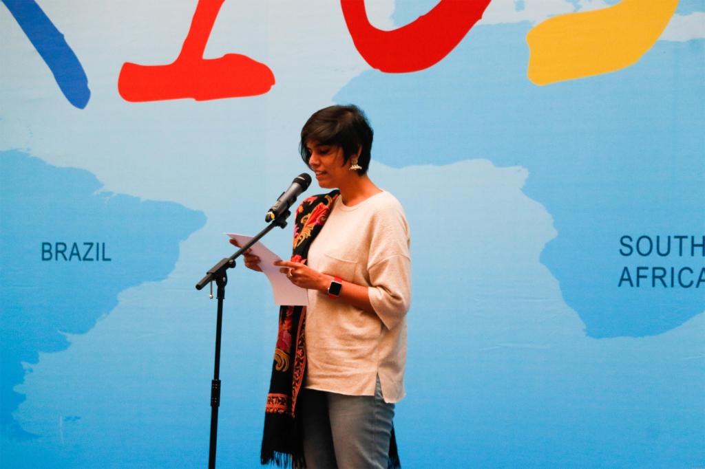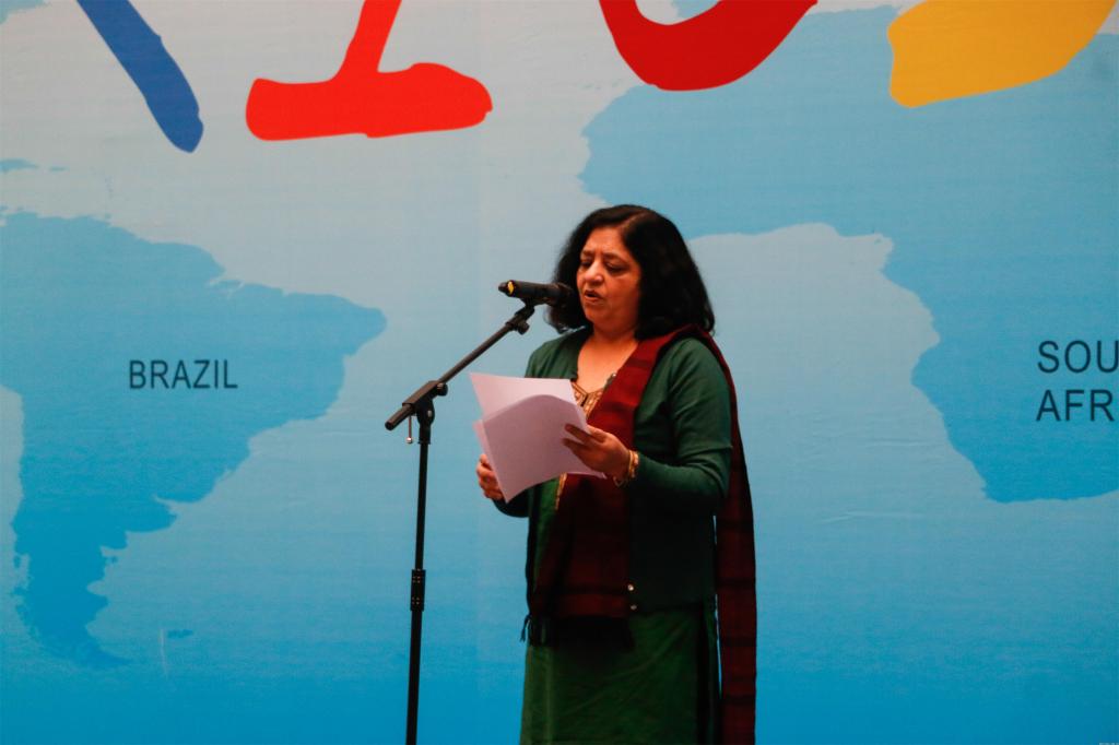 接下来上场的印度著名作家美瑞杜拉·嘉戈朗诵了小说《在印椣树下》。印椣树四季常青、不怕干旱,她希望通过这段朗诵,向在场师生传达印椣树坚韧不拔的精神。