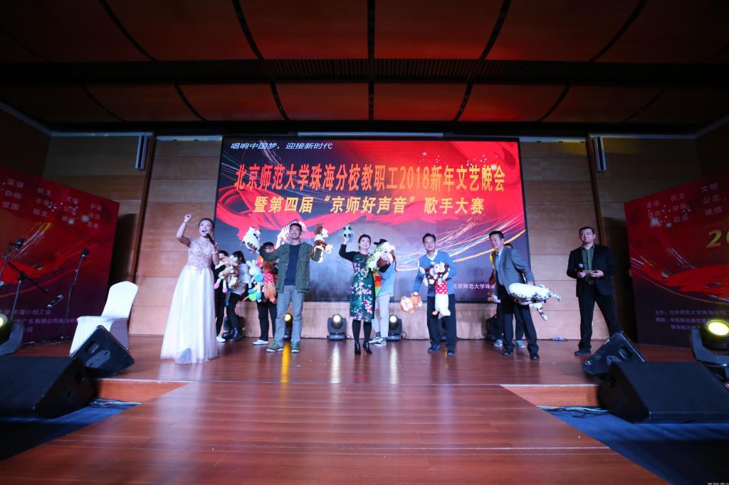 2018新年晚会暨“京师好声音”歌手大赛,包括16组选手的歌曲表演、资产公司与运动休闲学院的时装秀表演、教职工合唱团和健身舞蹈协会带来的特别演出。校党委副书记金洋出席晚会并致新年贺词,他回顾了过去一年珠海分校取得的办学成绩,代表学校向全体教职工表达了衷心的感谢和真诚的祝福。随后,金洋和校工会三位副主席一同向台下的观众抛掷吉祥物,给大家送上新年礼物。